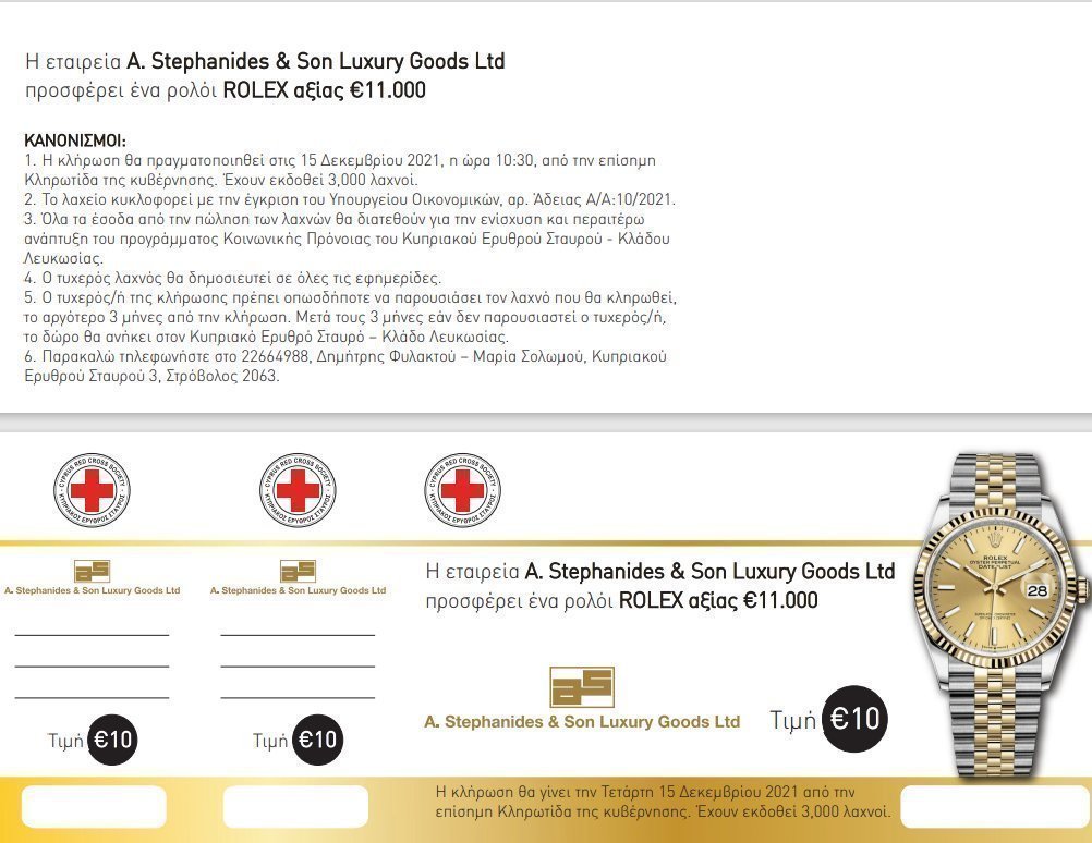 Αγοράζοντας ένα λαχνό συνεισφέρεις έμπρακτα στην κάλυψη βασικών αναγκών ατόμων που αντιμετωπίζουν δυσκολίες στη ζωή τους. Ο Κυπριακός Ερυθρός Σταυρός - Κλάδος Λευκωσίας στο πλαίσιο της ενίσχυσης και περαιτέρω ανάπτυξη του Προγράμματος Κοινωνικής Πρόνοιας, έχει εκδώσει 3000 λαχνούς προς πώληση με δώρο ένα ρολόι ROLEX αξίας €11.000. Η αξία του κάθε λαχνού είναι στα €10 και η κλήρωση του δώρου θα πραγματοποιηθεί την Τετάρτη 15 Δεκεμβρίου 2021 στα γραφεία του κρατικού λαχείου. Ο λαχνός κυκλοφορεί με την έγκριση του Υπουργείου Οικονομικών, αρ. Άδειας Α/Α:10/2021. Οι λαχνοί πωλούνται στα γραφεία του Κυπριακού Ερυθρού Σταυρού – Σταυρού Κλάδου Λευκωσίας στην οδό ΚΥΠΡΙΑΚΟΣ ΕΡΥΘΡΟΣ ΣΤΑΥΡΟΣ 3, 2063 ΣΤΟΒΟΛΟΣ, ΛΕΥΚΩΣΙΑΣ καθημερινά (Δευτέρα – Παρασκευή) μεταξύ των ωρών 8:00 – 15:30. Για περισσότερες πληροφορίες παρακαλώ επικοινωνήστε μαζί μας στο 22664988 – Μαρία Σολωμού.